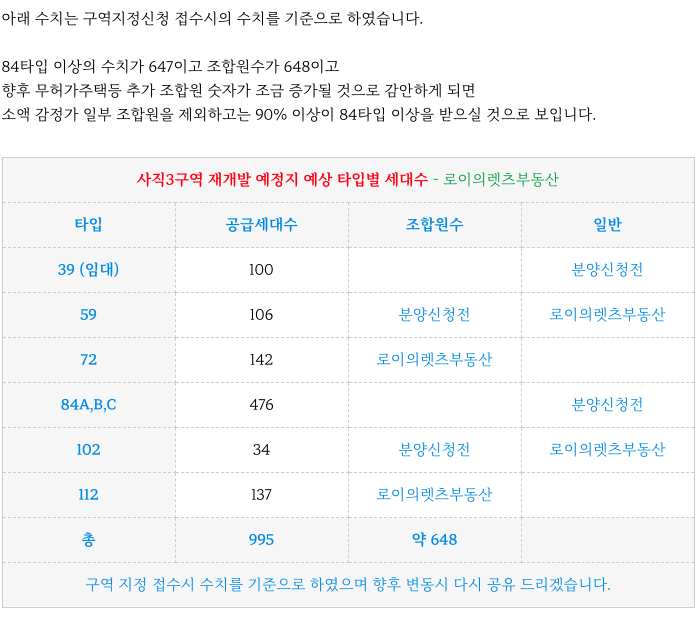 사직3구역 재개발 예정지의 예상 타입별 세대수 입니다.
