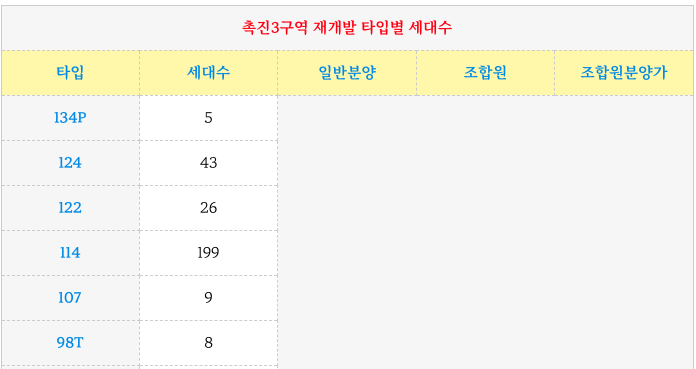 시민공원 촉진3구역 재개발 의 사업시행인가상의 각 타입별 세대수 입니다.
