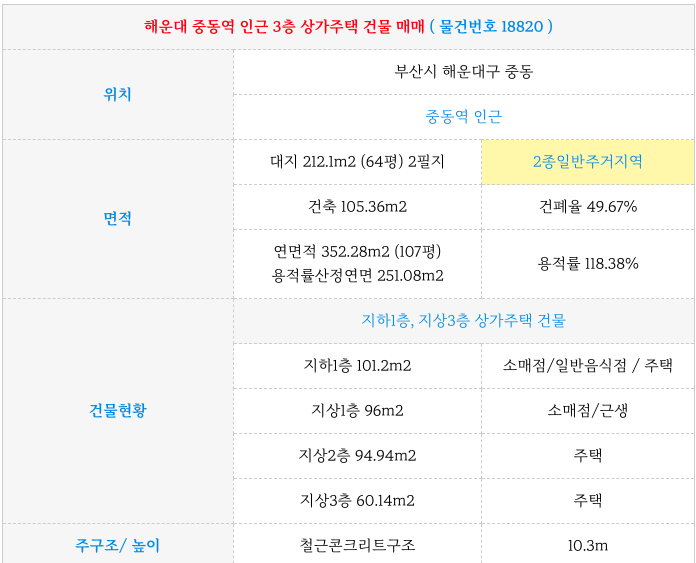 오늘 해운대 중동역 인근 3층 상가 주택 건물 제원 정리해 드리겠습니다.