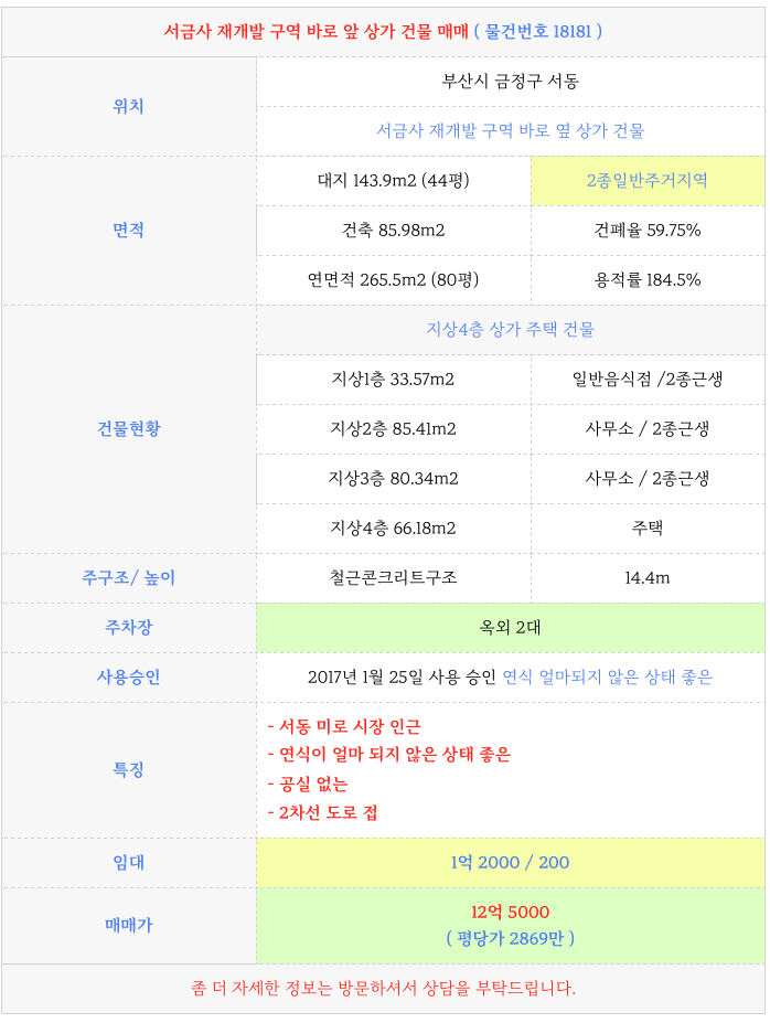 서동 미로시장 인근 서금사 재개발 구역 바로 앞 4층 상가 주택 건물 매매