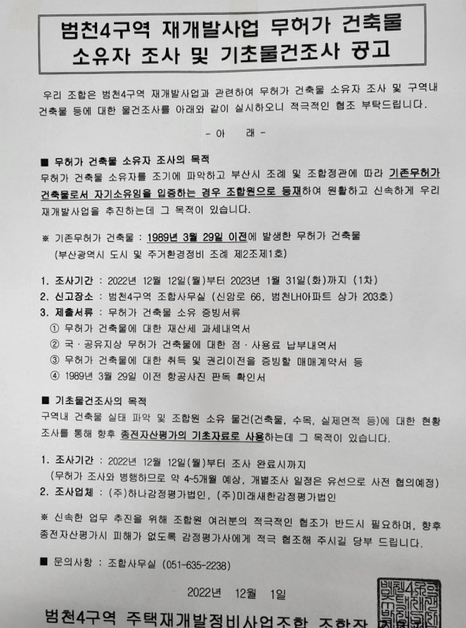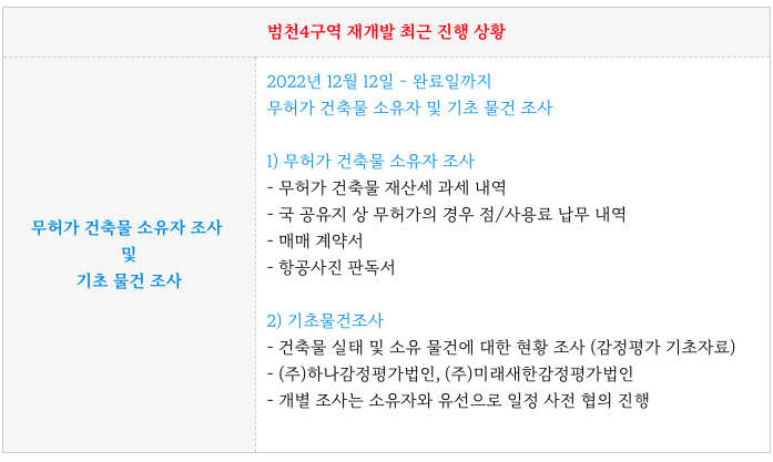 이후, 무허가 건축물 및 기초 물건 조사를 진행 중에 있습니다.