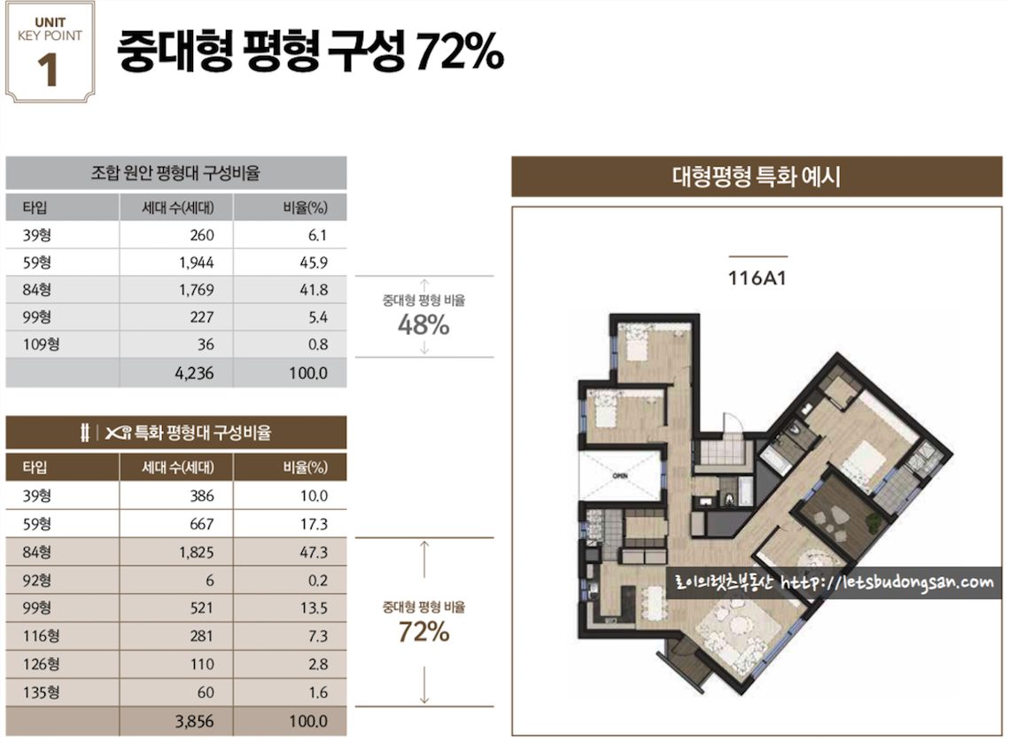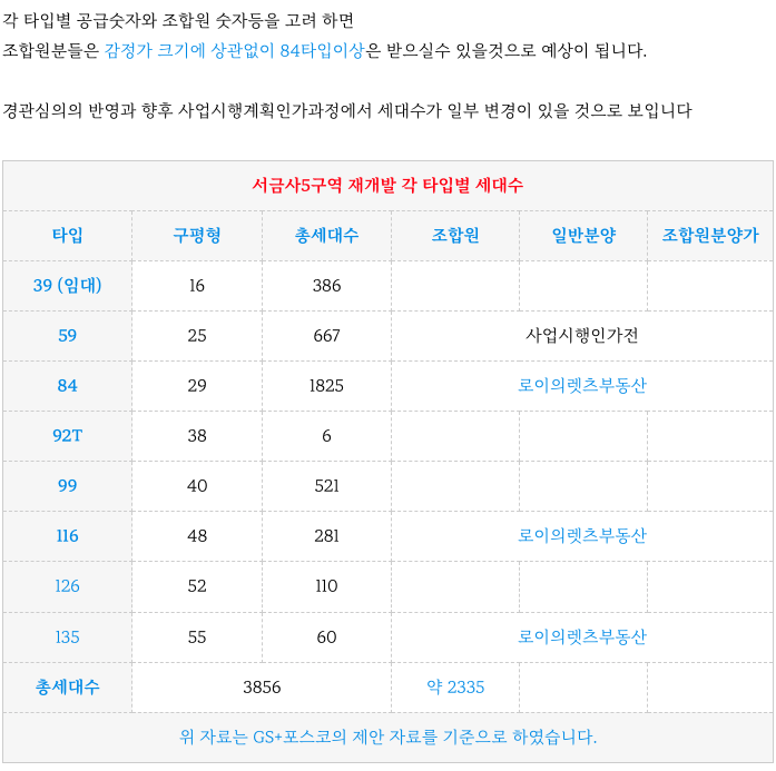 서금사5구역 재개발의 시공사에서 제안안 각 타입 세대수 입니다.