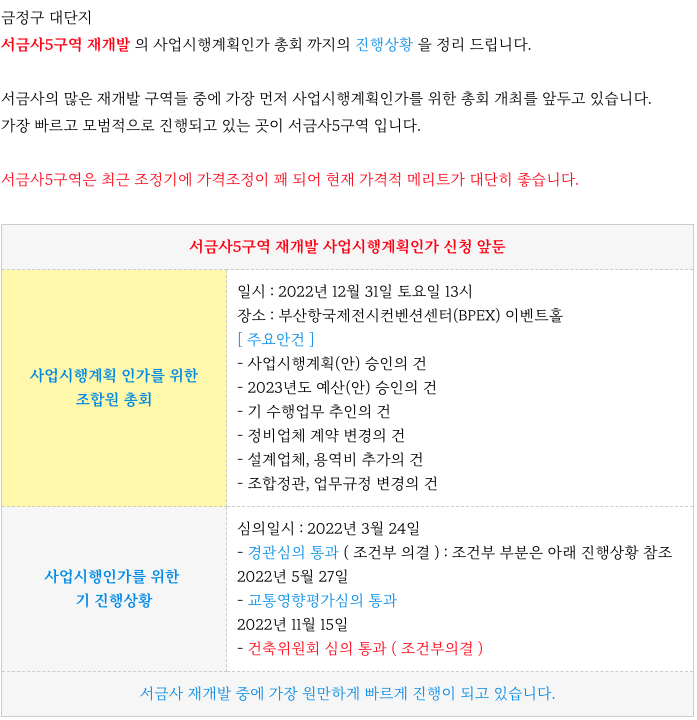 서금사5구역 재개발의 현재까지의 진행상황을 정리등 추가 정보는 아래 페이지를 참고 부탁드립니다.
