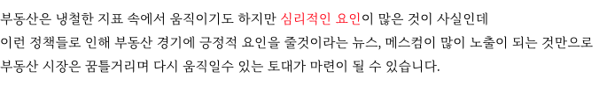 현재 급매물들의 소화로 거래 절벽이 해소 될 수 있는데 도움이 될 것으로 보입니다.