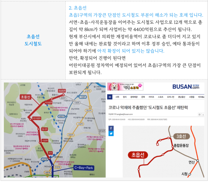 아직 미정인 초읍선도시철도는 가장 큰 단점인 지하철 비역세권을 보완해주는 것으로 접근성이 개선되고