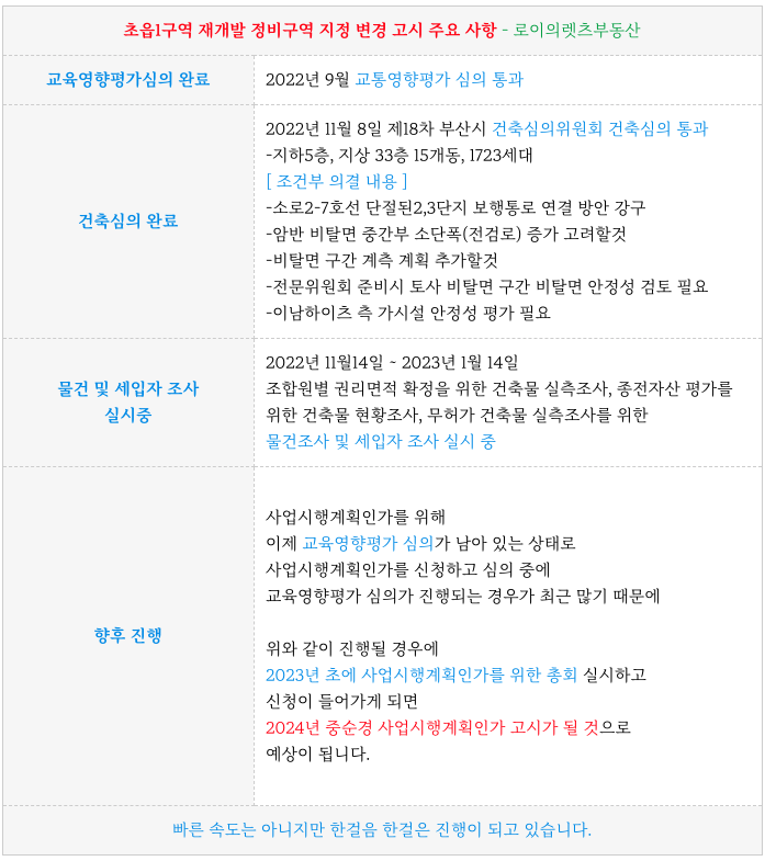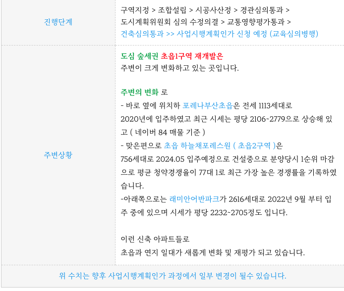 초읍1구역 재개발의 현재까지의 진행상황 정리 등 추가 정보는 아래 페이지를 참고 부탁드립니다.