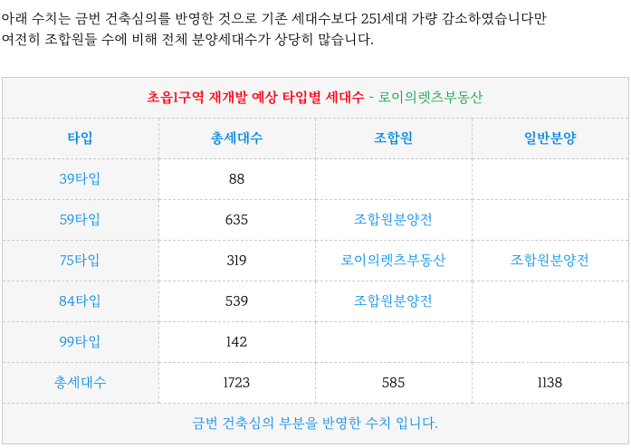 초읍1구역 재개발 건축심의 반영 예상 타입별 세대수 입니다.