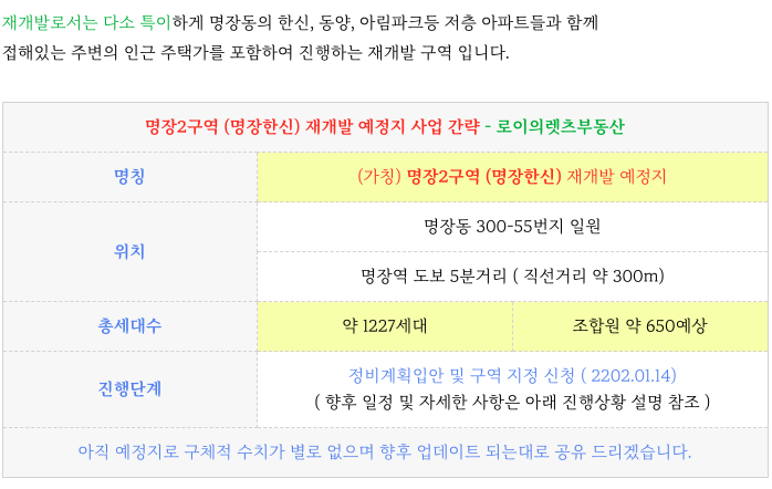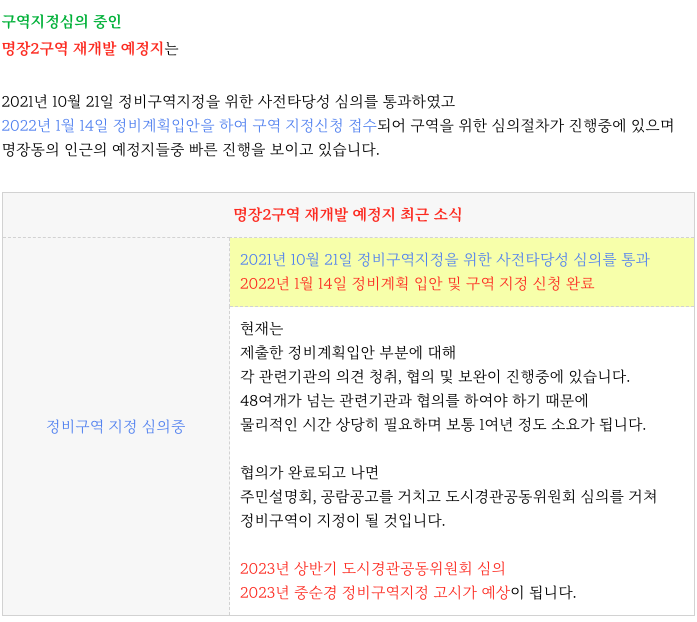 명장2구역 재개발 예정지의 기진행상황과 향후 예상 일정등 추가 정보는 아래 페이지를 참고 부탁드립니다.