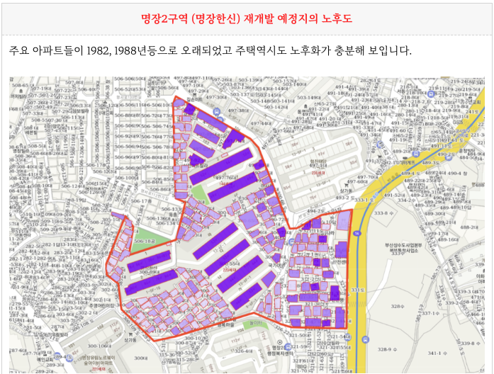 바로 인근의 왼쪽편으로 명장3구역 재개발 예정지, 그리고 윗쪽으로 명장2동 재개발 예정지가 있어