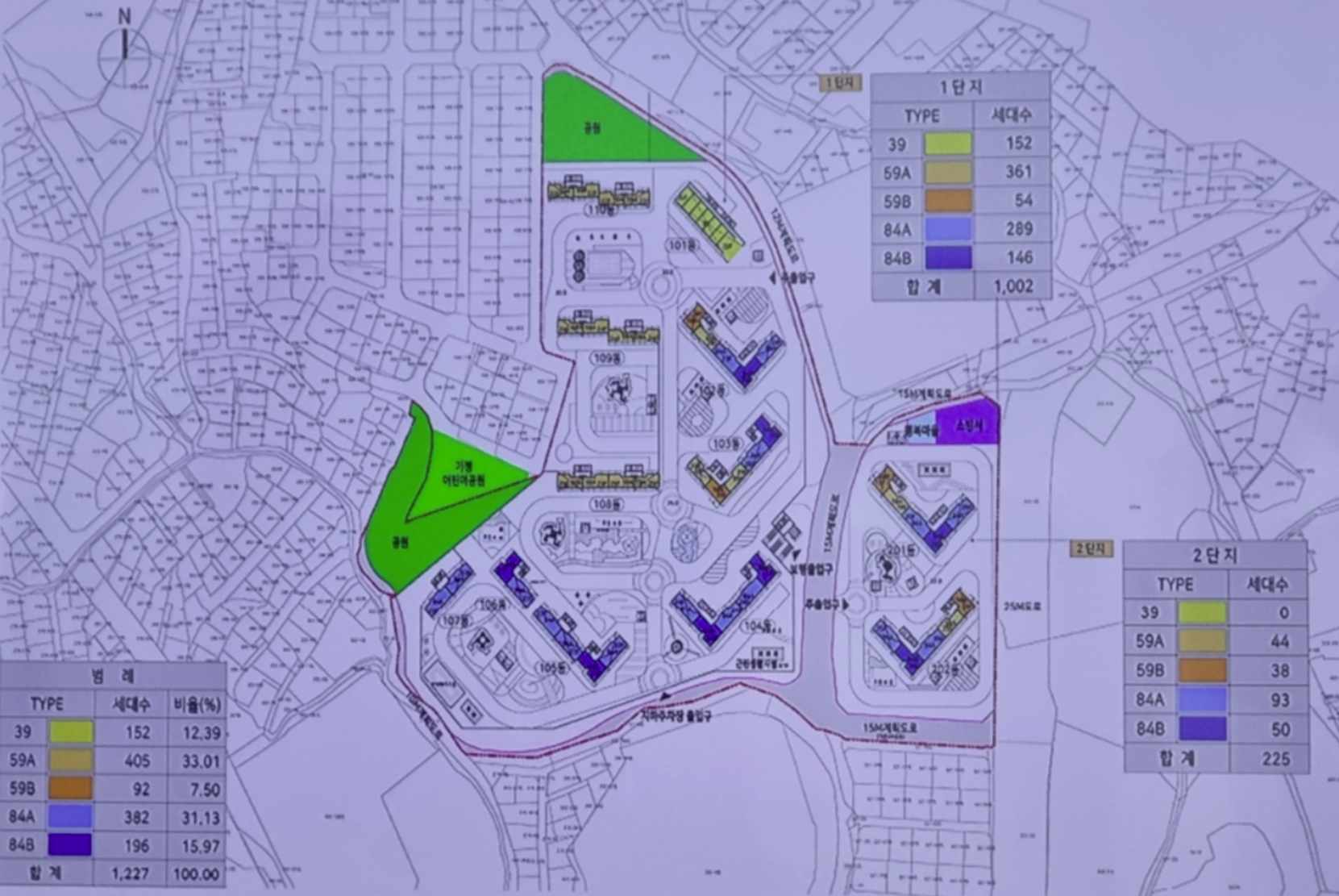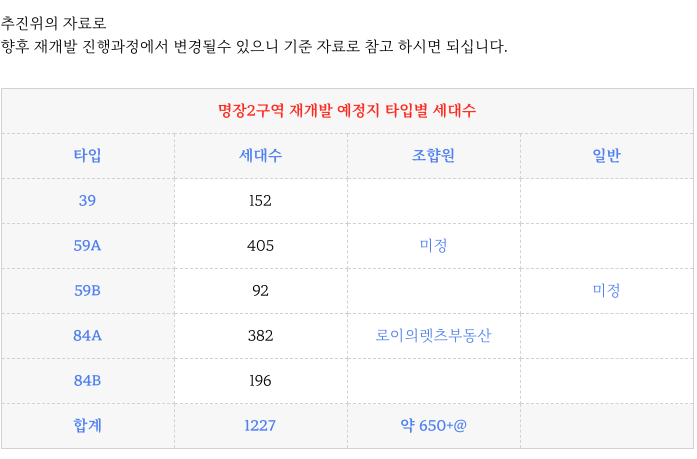 명장2구역 재개발 예정지의 현재 예상 타입별 세대수 입니다.