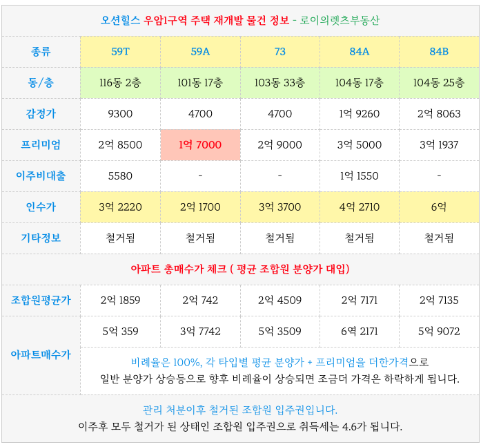 우암1구역 재개발 59타입 급매 물건과 타입별 최저 물건 소개해 드리겠습니다.