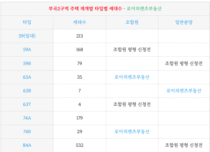 부곡2구역 재개발의 타입별 세대수 입니다.