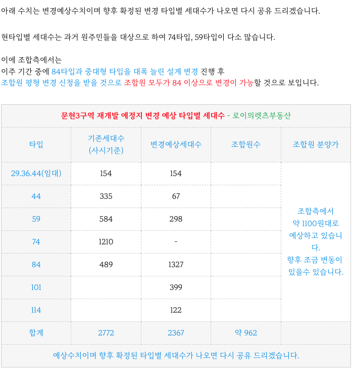 문현3구역 재개발의 현 타입별 세대수 입니다.
