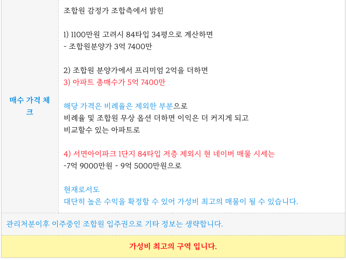 - 진행대비 프리미엄이 낮아 가성비 좋고 관리처분계획인가로 불확실성이 낮은