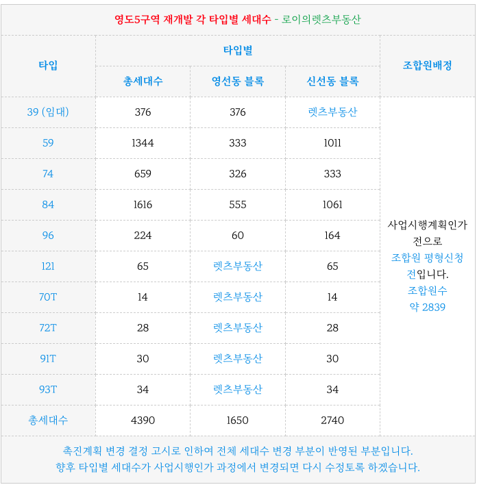 영도5구역 재개발의 변경결정고시 기준를 통한 타입별 세대수 입니다.