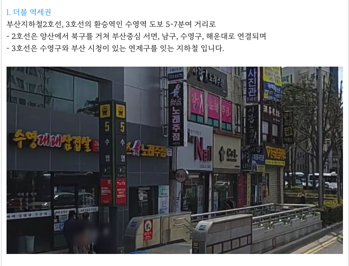 부산 핵심지하철 2호선, 3호선 환승센터인 수영역 도보 5~7분여 거리에 위치한 역세권 이고