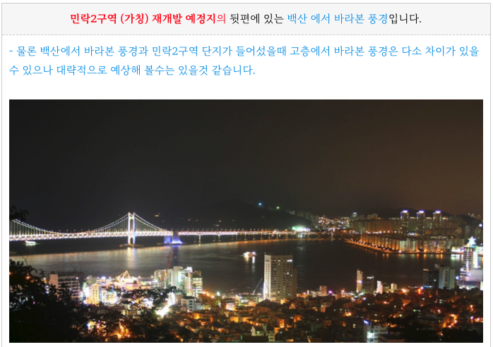아래는 백산에서 바라본 풍경 사진이며 민락2구역 단지가 들어섰을때 고층에서 바라본 풍경은