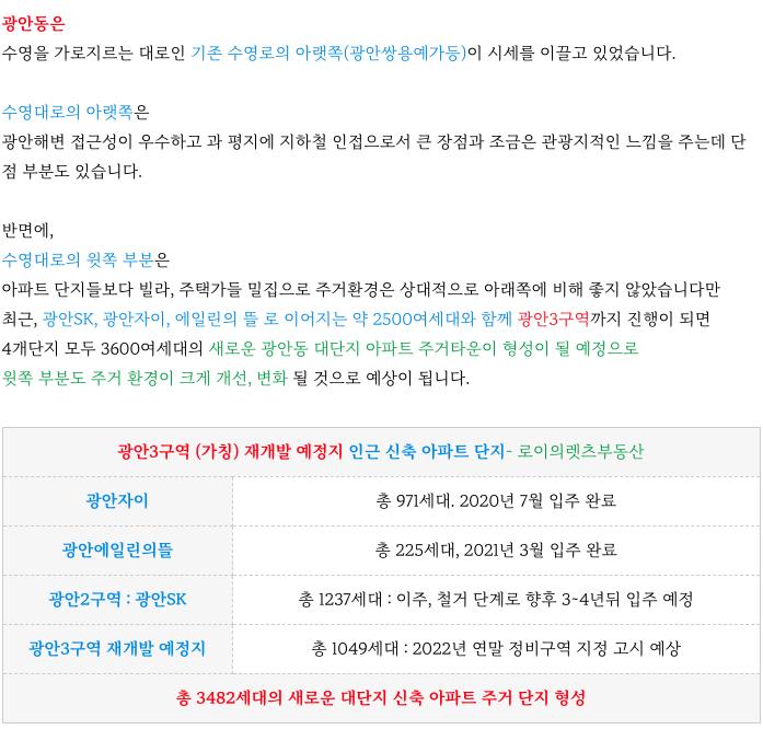 광안3구역 재개발을 비롯한 광안동의 주변 상황을 정리해 드리겠습니다.