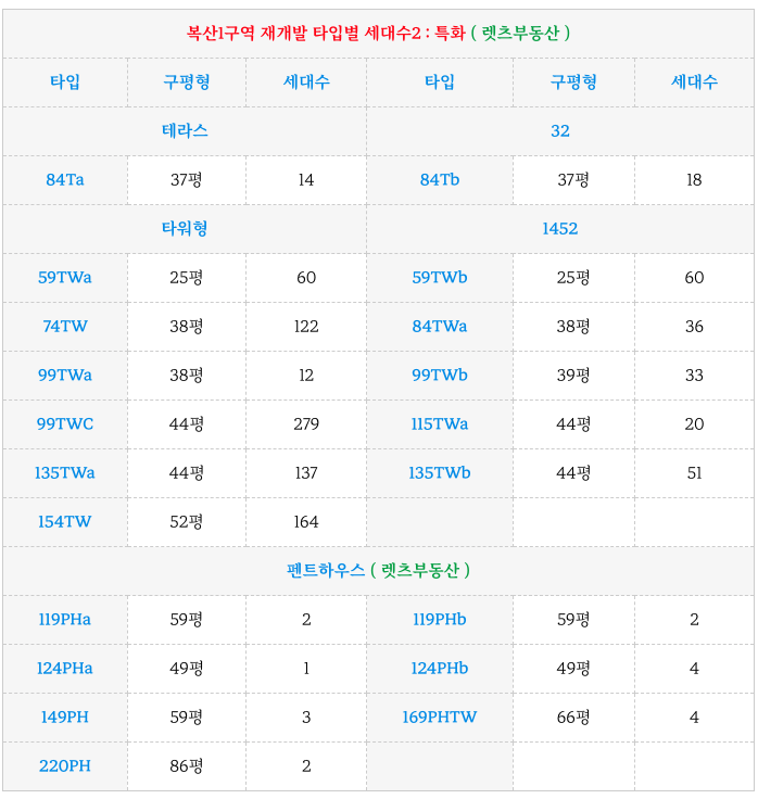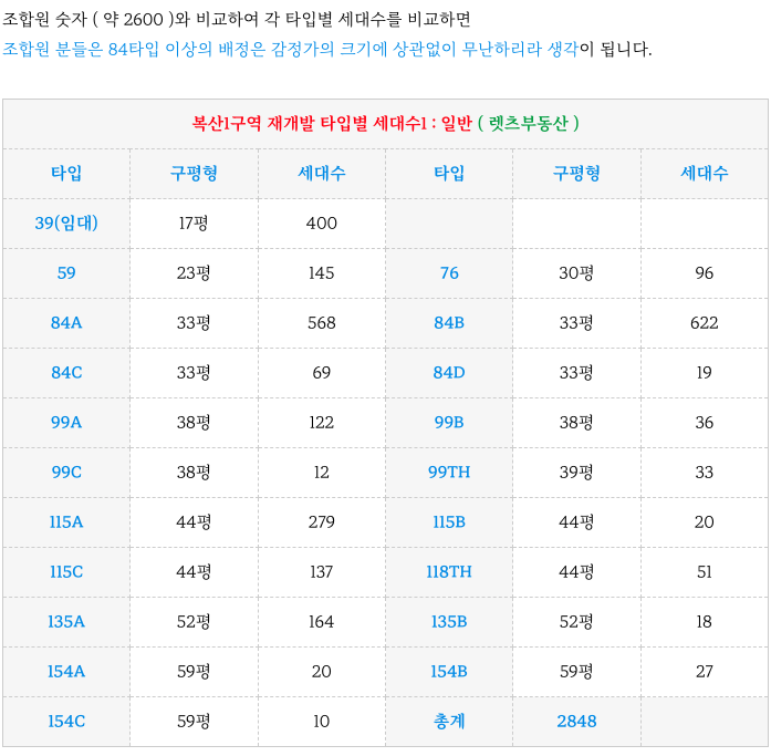 동래구 복산1구역 재개발 각 타입별 세대수입니다.