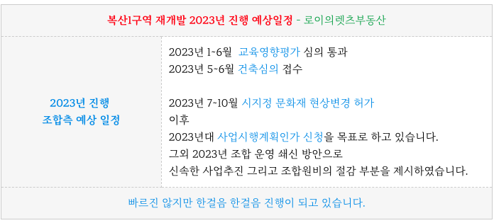 복산1구역 재개발 의 현재까지의 진행상황을 정리등 추가 정보는 아래 페이지를 참고 부탁드립니다.