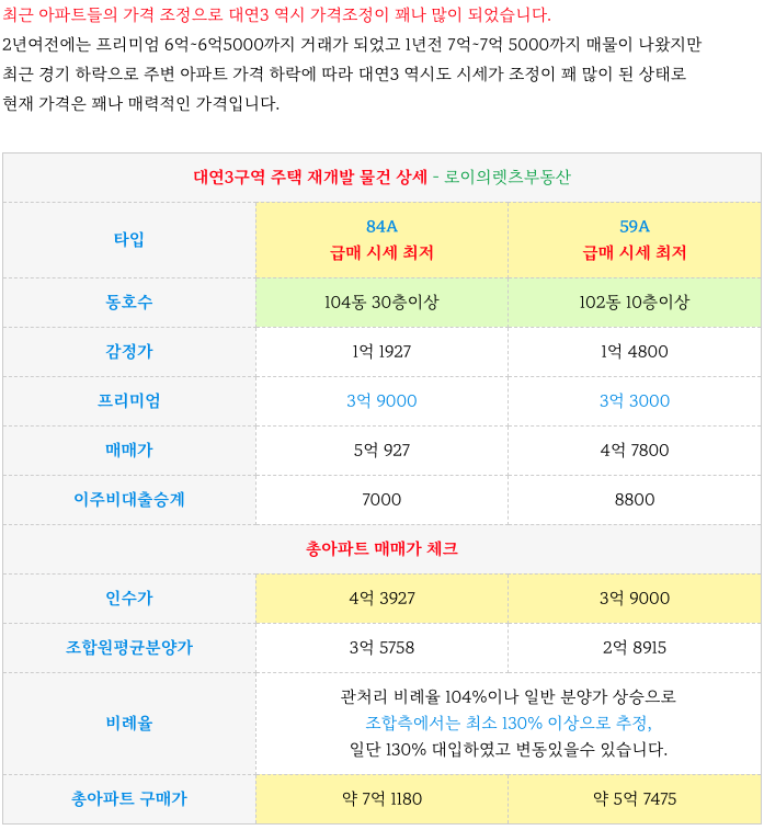대연3구역 재개발 급매 물건 ( 84타입, 59 타입 ) 소개해 드리겠습니다.