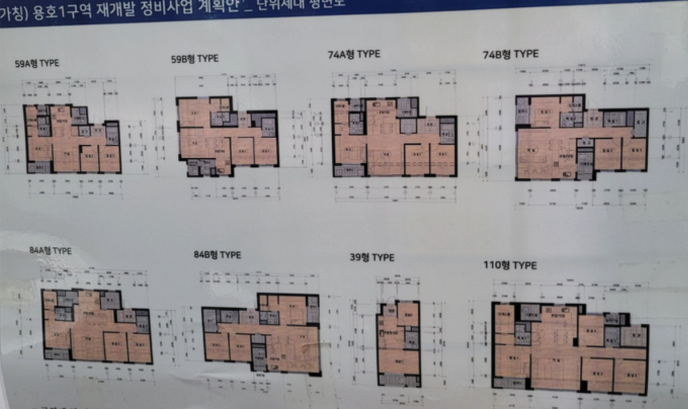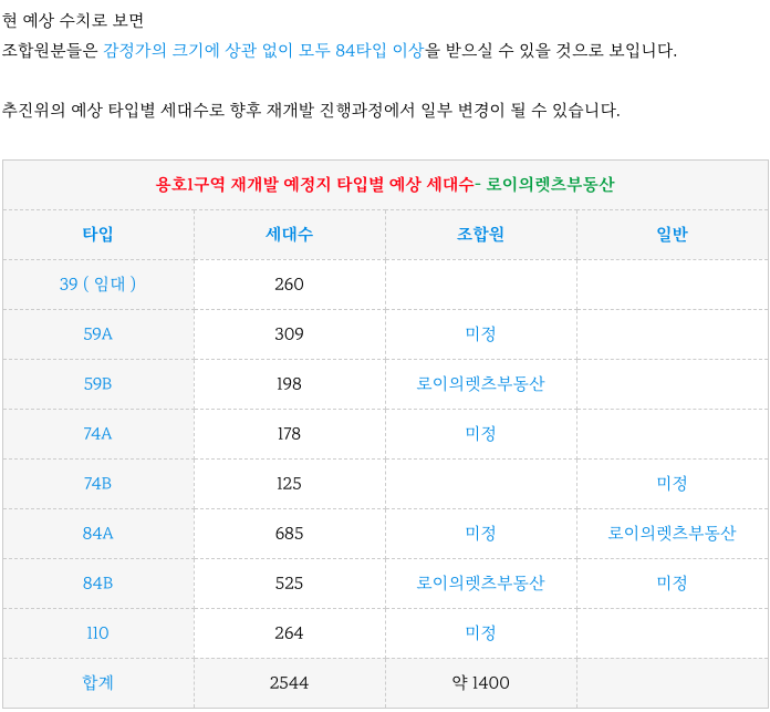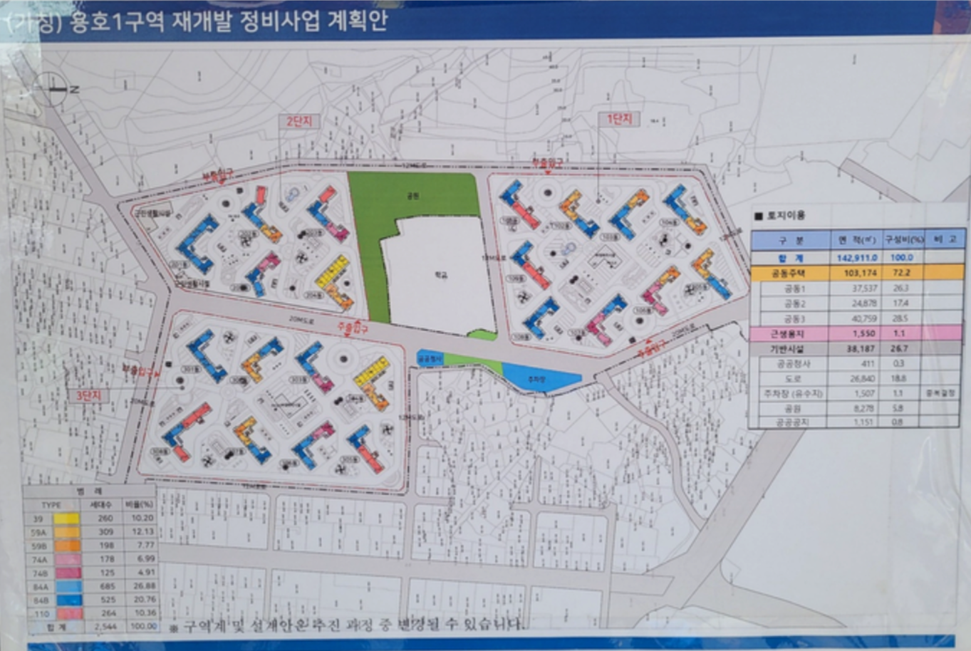 부산 남구 용호1구역 재개발 예정지의 타입별 세대수 입니다.