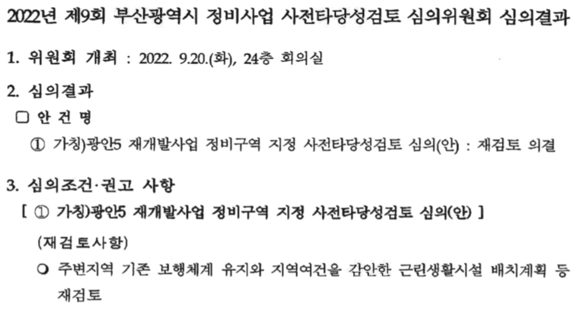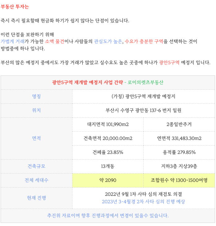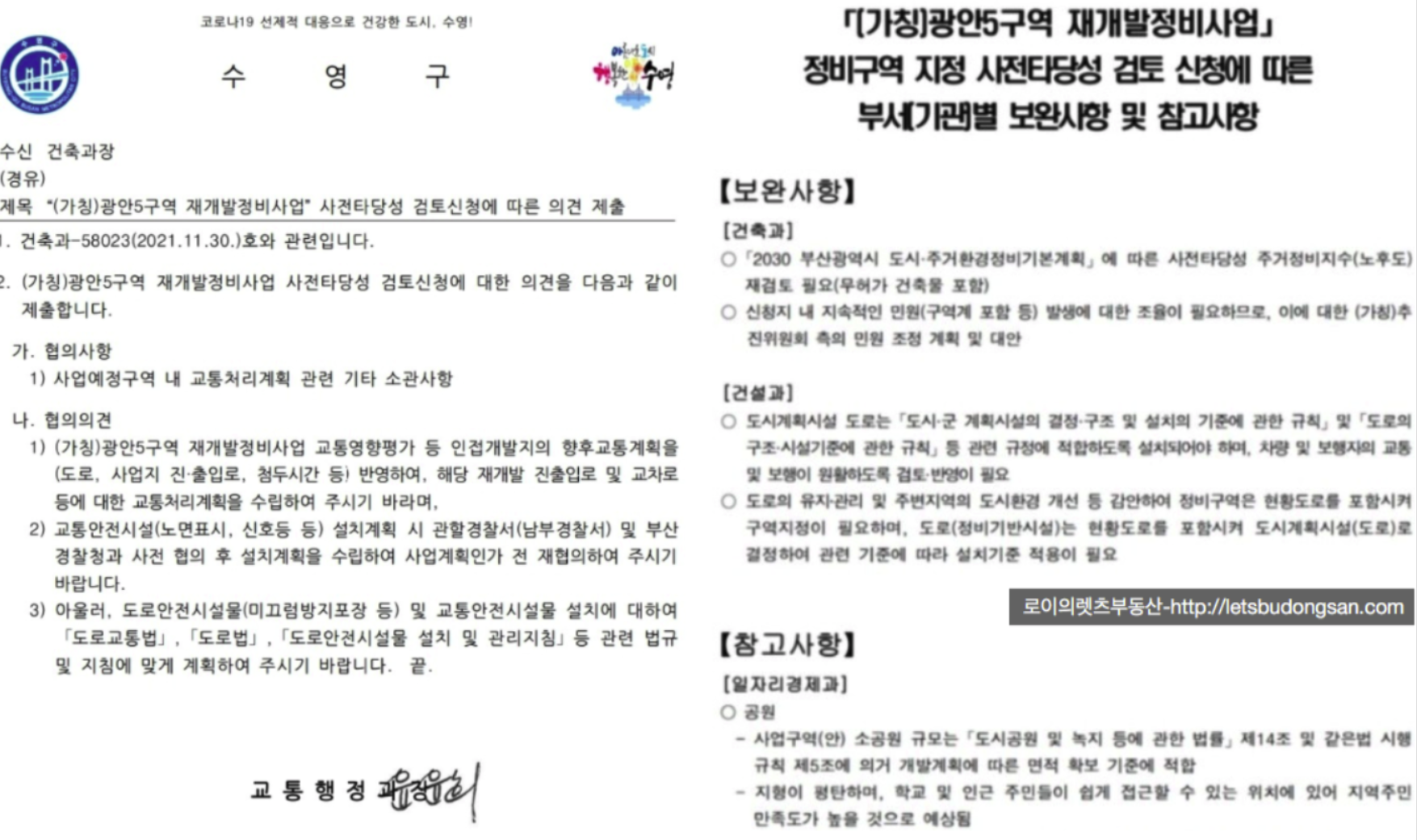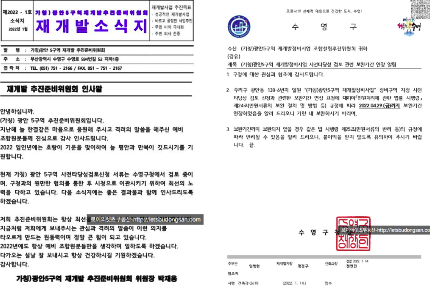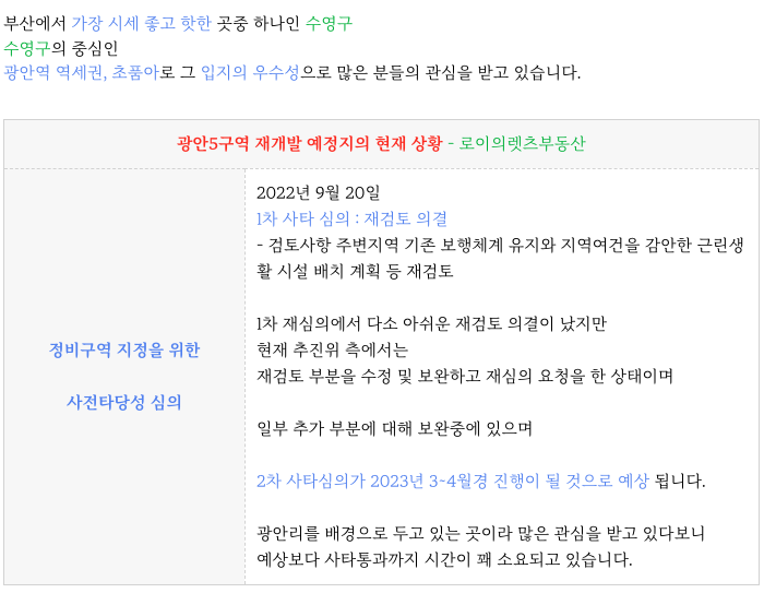 광안5구역 재개발의 현재까지의 초기 진행상황 정리등 추가 정보는 아래 페이지를 참고 부탁드립니다.