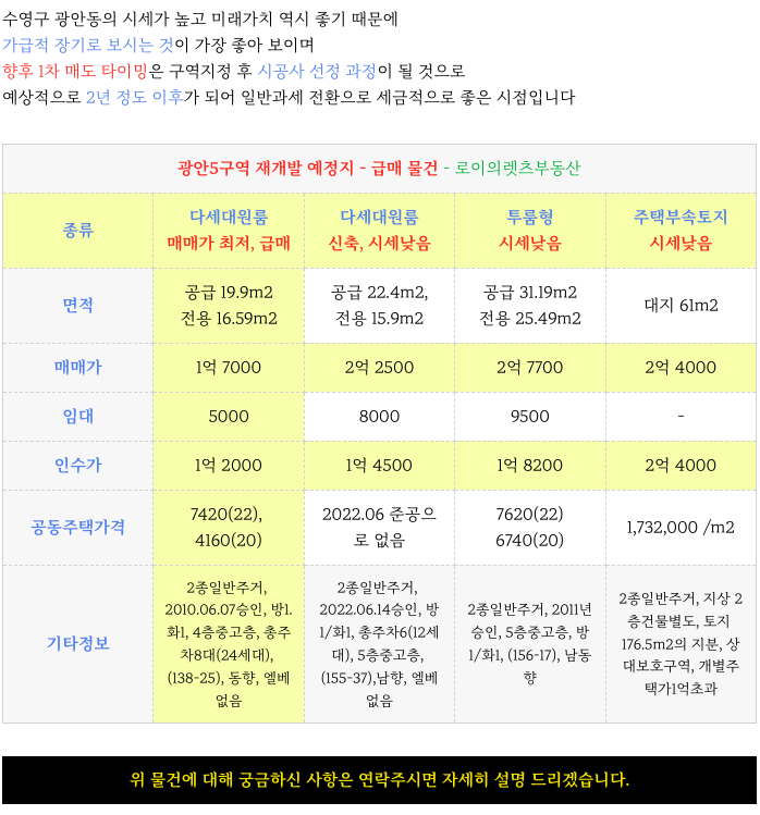 광안5구역 재개발 예정지의 인수가 최저 급매 들을 소개해 드리겠습니다.