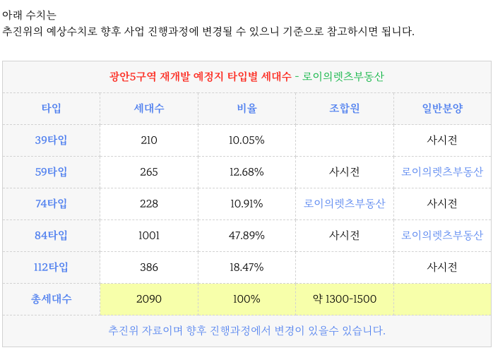 광안5구역 재개발 예정지의 추진위 예상 타입별 세대수 입니다.
