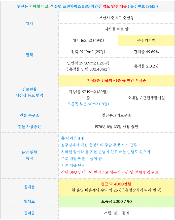 연산동 지하철 바로 앞 유명 프랜차이즈 BBQ 치킨점 양도 양수 임대 물건