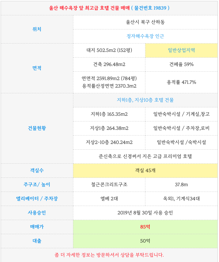 울산 바다 조망 프리미엄 고급 호텔, 모텔 건물 매매