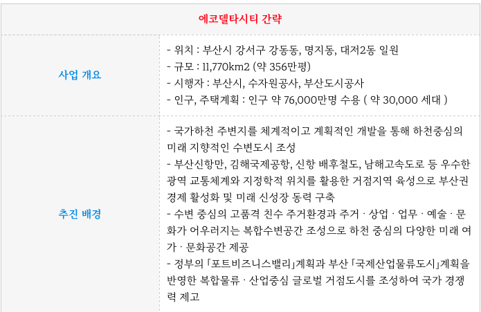 부산의 중요 프로젝트인 에코델타시티에 대해 간략하게 설명 드리겠습니다.