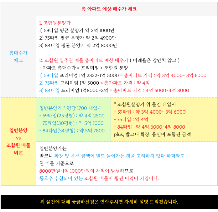 * 아래 총 아파트 매수가 그리고 예상 일반 분양가와 비교하여 보시면 됩니다.