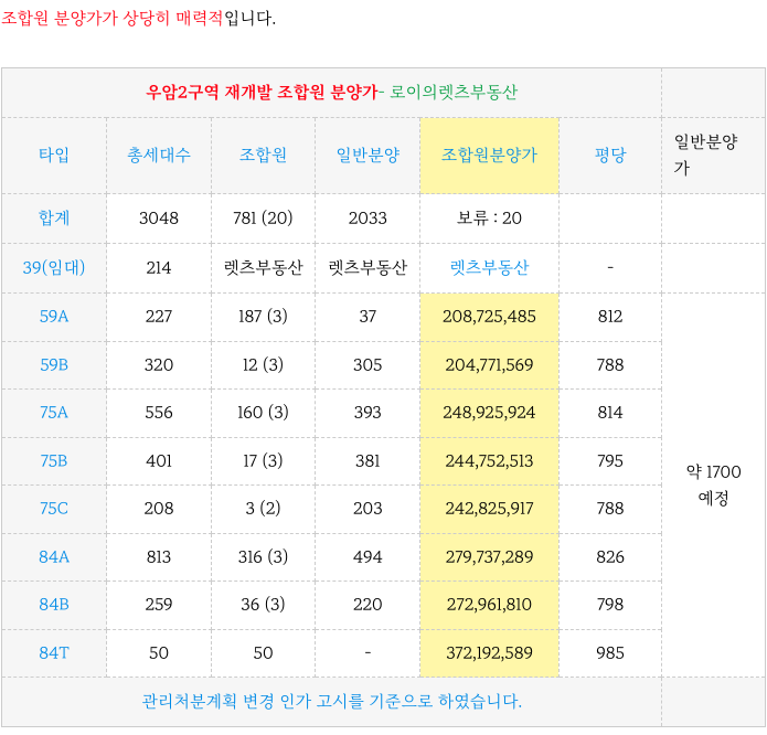 우암2구역 재개발의 타입별 세대수와 조합원 분양가 입니다.