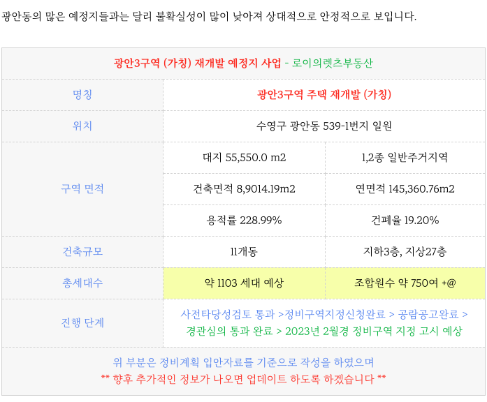 광안3구역 재개발 예정지의 아직 초기이지만 현재까지의 진행상황등은 아래 페이지를 참고 부탁드립니다.