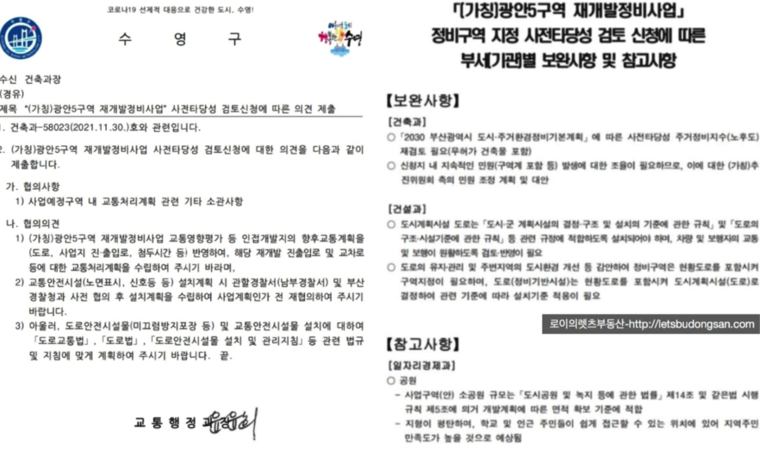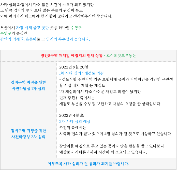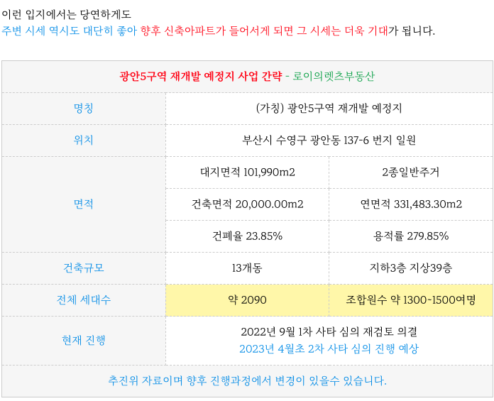 광안5구역 재개발의 현재까지의 초기 진행상황 정리등 추가 정보는 아래 페이지를 참고 부탁드립니다.