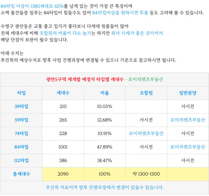 광안5구역 재개발 예정지의 추진위 예상 타입별 세대수 입니다.