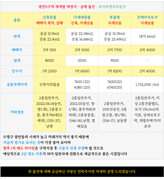 광안5구역 재개발 예정지의 인수가 최저 물건 들을 소개해 드리겠습니다.