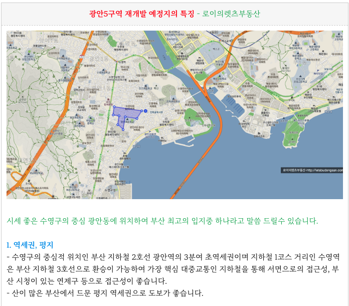 광안5구역 재개발 예정지의 특징 들을 간략히 정리하였습니다.
