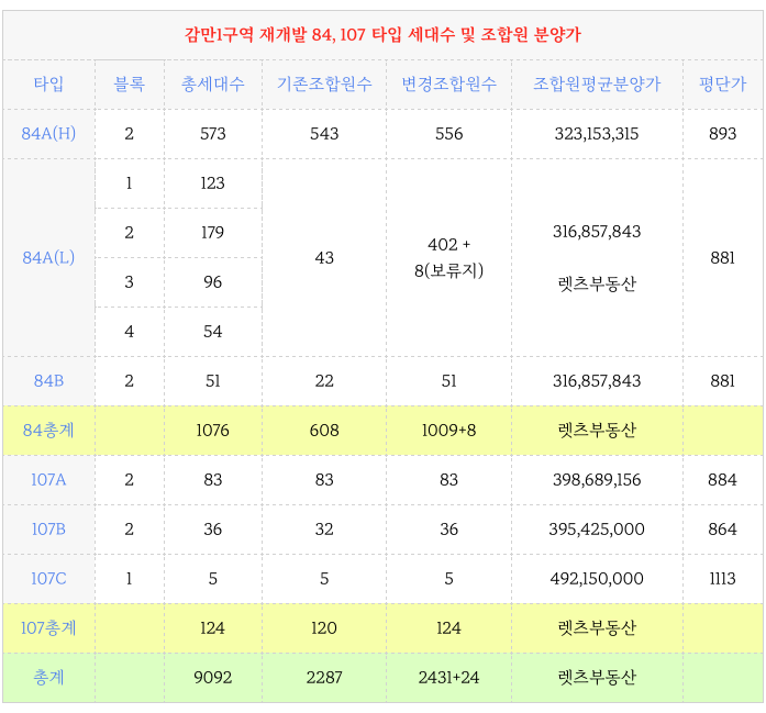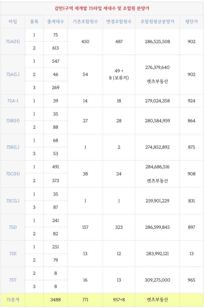 감만1구역 재개발의 각 타입별 세대수 및 조합원 분양가 입니다.