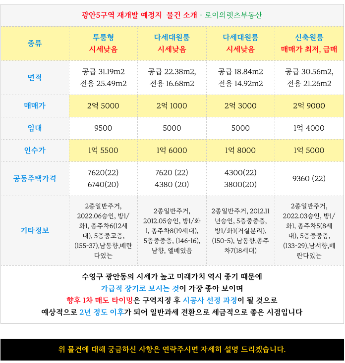 광안5구역 재개발 예정지의 인수가 최저 물건 들을 먼저 소개해 드리겠습니다.