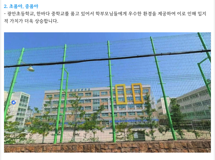 광안초등학교, 한바다 중학교를 품고 있는 초,중품아의 장점으로 입지를 더욱 빛나게 하고 있으며