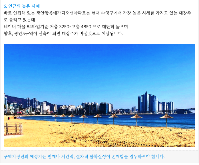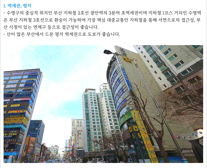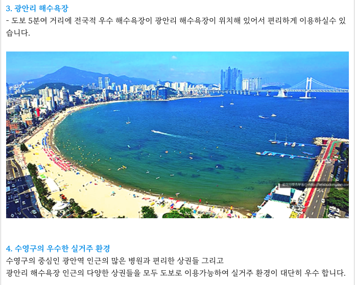 - 수영구 중심 광안동, 광안리 해수욕장, 주변시세 높은