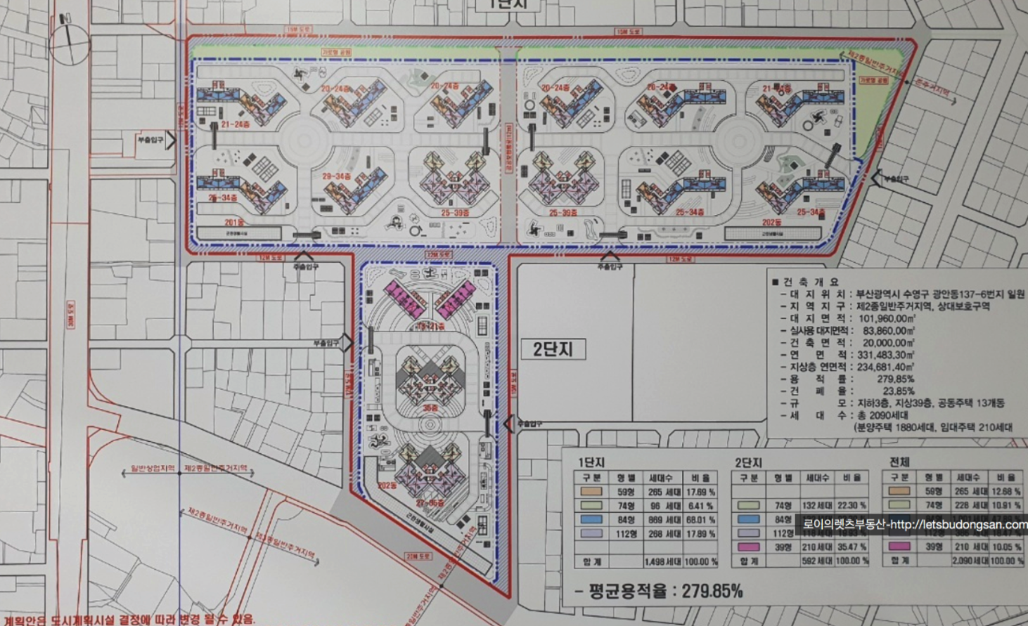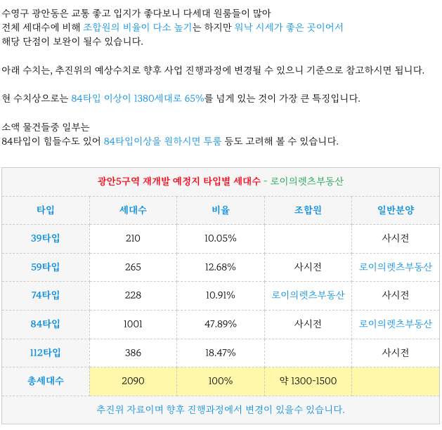 광안5구역 재개발 예정지의 추진위 예상 타입별 세대수 입니다.
