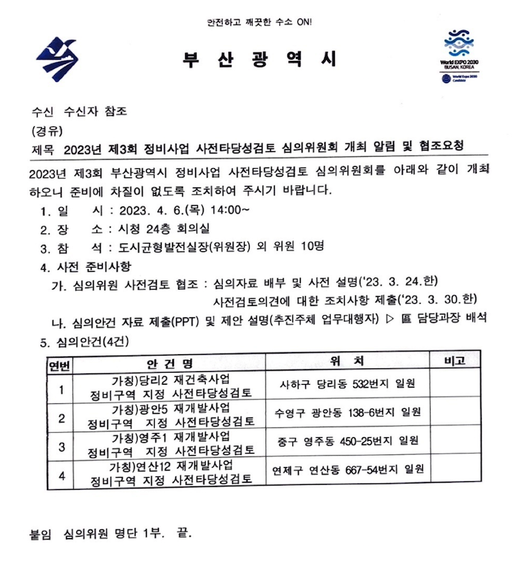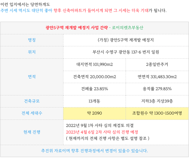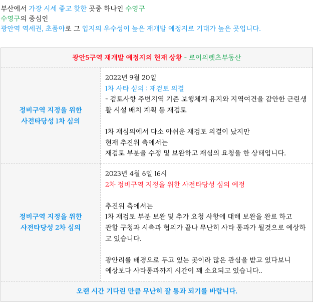광안5구역 재개발의 현재까지의 초기 진행상황 정리등 추가 정보는 아래 페이지를 참고 부탁드립니다.