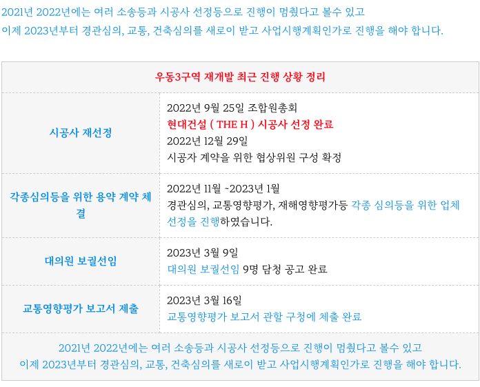 해운대 우동3구역 재개발의 현재까지 진행상황을 간략히 정리 및 추가 정보는 아래 페이지를 참고 부탁드립니다.