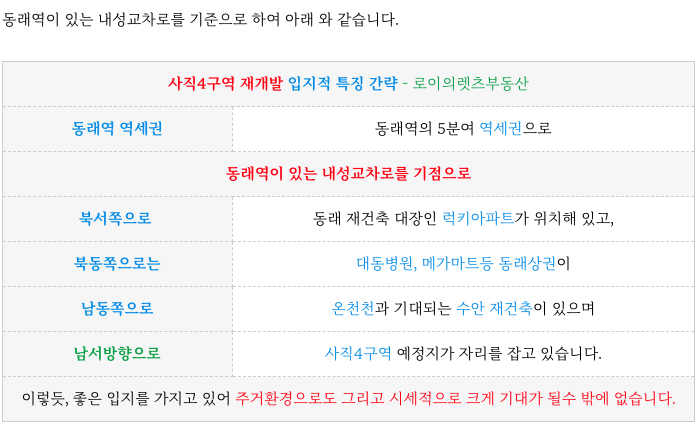 - 동래역 역세권, 초품아, 중품아, 학군좋은, 평지, 온천천, 동래 상권 등
