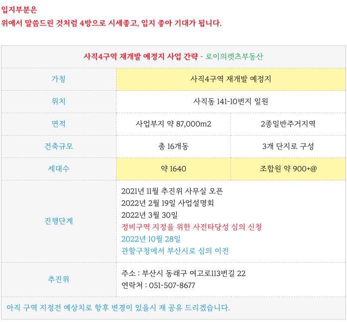 안녕하세요. 로이의렛츠부동산 ( 제이에이케이 부산 부동산중개법인 ) 입니다. 오늘은 사직4구역 재개발 예...