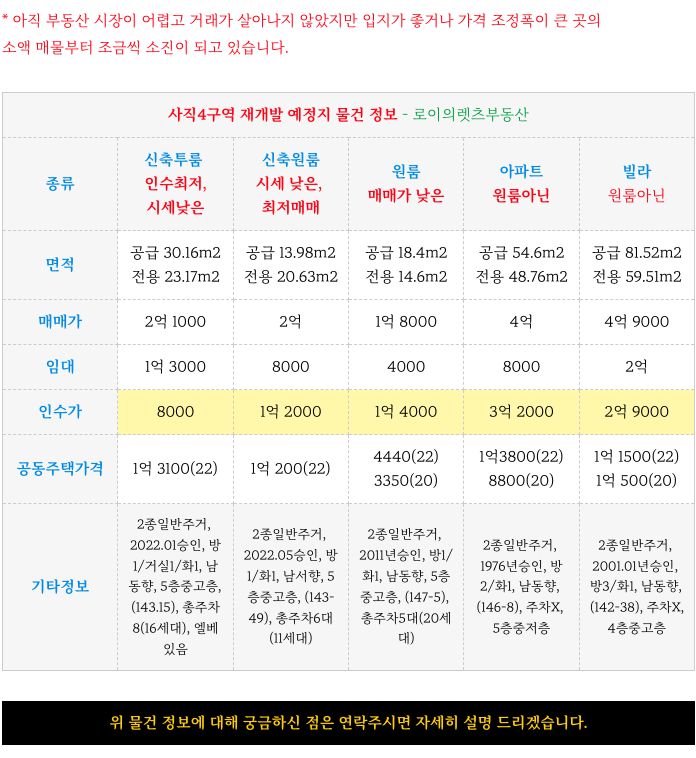 * 사직4구역 물건도 소액인수가 매물들이 좀 소진이 되었습니다.