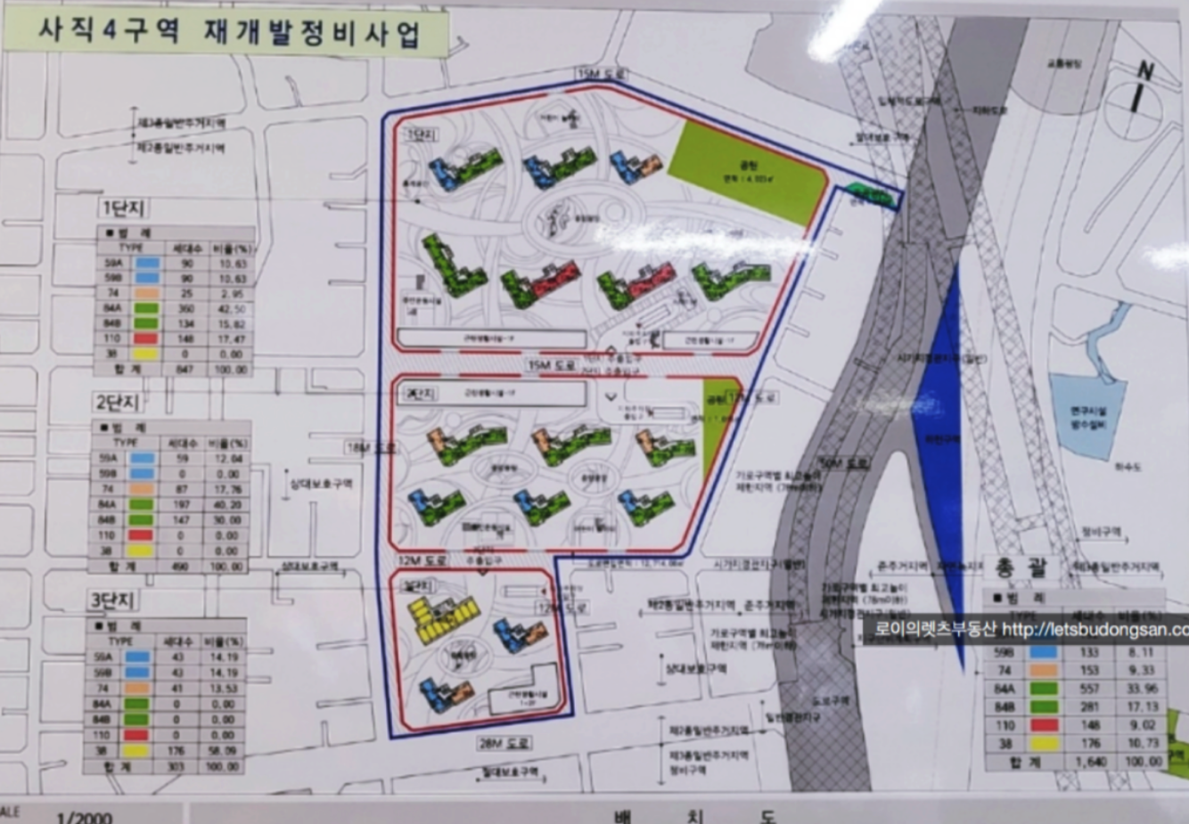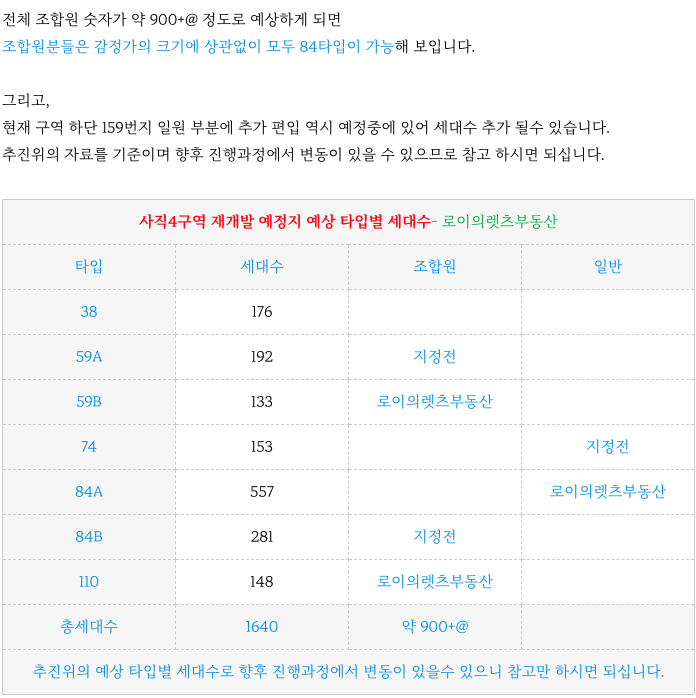 사직4구역 재개발의 현재 추진위에서 밝힌 예상 타입별 세대수 입니다.